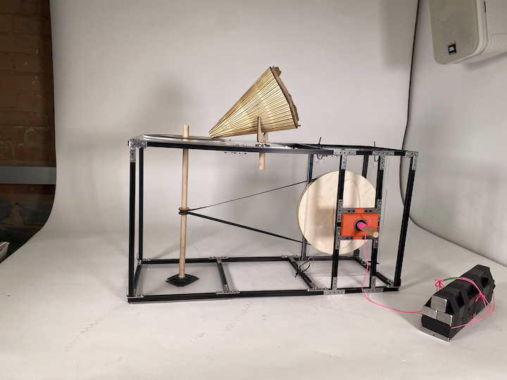 Another obstacle pertained to ensuring a consistent rotational speed, thereby necessitating the introduction of friction to counterbalance the acceleration due to gravity. Calculating the precise amount of theoretical friction needed seemed a formidable task, prompting us to devise an adjustable friction system. As depicted in the photo on the right, our solution incorporated acrylic sheets flanking the wheel, enabling us to apply pressure and augment friction within the system as required.