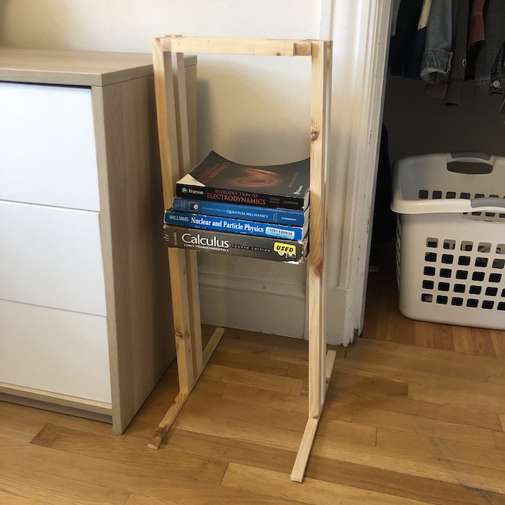 This was my first experience using any of the woodworking power tools. The long cuts were made with a table saw, the shorter cuts were made with a band saw, handsaw, or a chop saw, and the 90 degree cuts were made with a manual jigsaw. Most of my cuts didn’t really turn out the way I wanted them to – the band saw kind of has a mind of its own, the chop saw takes away half of your wood, etc – but this only further contributed to my learning experience. I assembled the contents of the textbook cover using wood glue and a nail gun (my favorite tool) and attached them to the legs of the shelf by drilling in some pretty large nails. I also attached the bottom pieces (the ‘feet’) with nails, although I had a lot of issues with knots since these pieces were very thin. Finally, the top part was assembled using wood glue and attached to the legs using the nail gun.